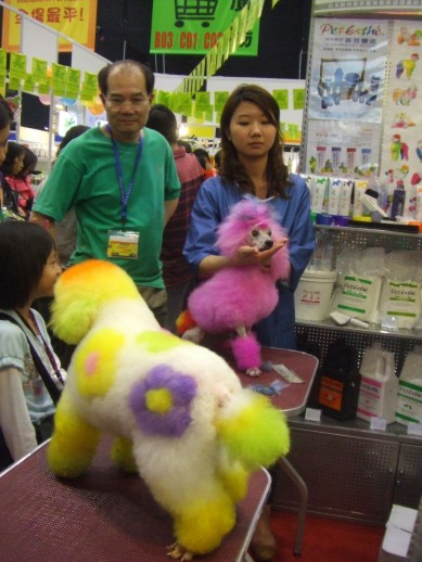 Da fiel uns ein Stand auf, wo man das Fell der Hunde einfaerben lassen konnte.