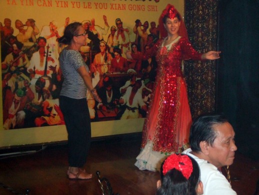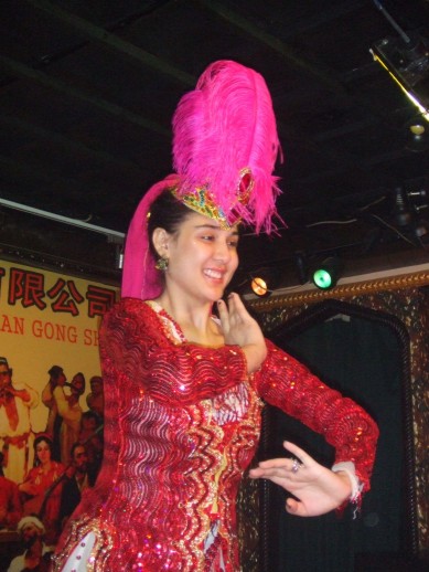 Das Zweite, ein uygurisch-muslimisches Restaurant inkl. Bauchtanzshow, war auch ein Gedicht. Die Taenzerin zog mich, als ich sie fotografieren wollte, auf die Buehne und forderte mich auf, mitzutanzen. Und…? Habe ich getanzt? Seht euch die Fotos an, vielleicht bin ich dabei…