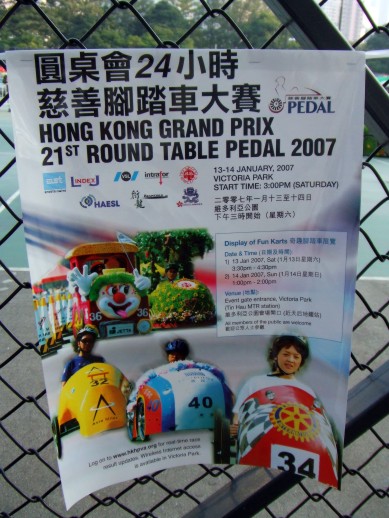 Durch Zufall hatten wir im HK-Magazine http://www.aziacity.com/hk von diesem Event „Hong Kong Grand Prix - Round Table Pedal 2007“gelesen. Das Ganze fand (schon zum 21. Mal) im Victoria-Park in Causeway Bay statt.