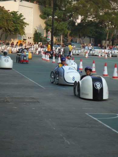 Ein 24-Stunden-Rennen, mit selbstgebauten, per Fusskraft (Pedalen) bewegten „Rennautos“.