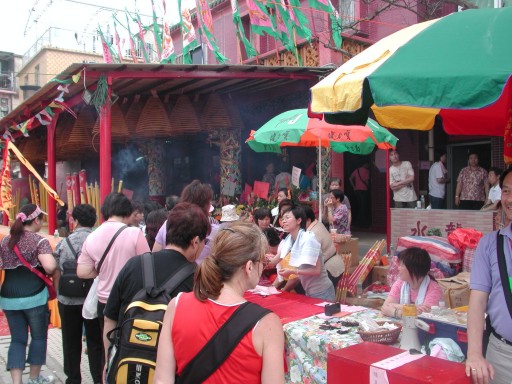 Wie der Zufall es wollte, war gerade Tin Hau Festival. Da ein grosser Teil der Bevoelkerung von Peng Chau noch vom Fischfang lebt, wird an diesem Tag die Schutzheilige der Fischer um ihren Beistand gebeten. Im Tempel, den man im Hintergrund sieht, werden dazu tonnenweise Raeucherstaebchen geopfert. Die “Bienenkoerbe” an der Decke sind uebrigens auch spiralfoermige Raeucherkerzen.