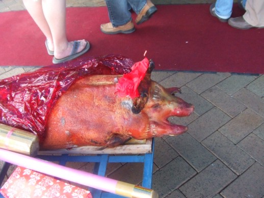 Opfergaben gab es auch. Darunter waren rot gefaerbte Eier und ein ganzes Schwein, das mit einem roten Tuch bedeckt war.